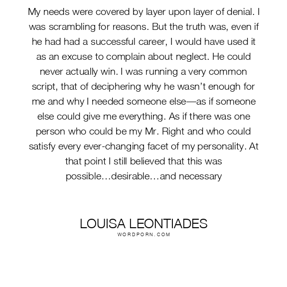 My needs were covered by layer upon layer of denial. I was scrambling for reasons. But the truth was, even if he had had a successful career, I would have used it as an excuse to complain about neglect. He could never actually win. I was running a very common script, that of deciphering why he wasn’t enough for me and why I needed someone else—as if someone else could give me everything. As if there was one person who could be my Mr. Right and who could satisfy every ever-changing facet of my personality. At that point I still believed that this was possible…desirable…and necessary