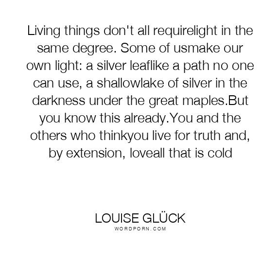 Living things don't all requirelight in the same degree. Some of usmake our own light: a silver leaflike a path no one can use, a shallowlake of silver in the darkness under the great maples.But you know this already.You and the others who thinkyou live for truth and, by extension, loveall that is cold