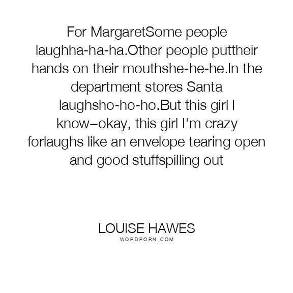 For MargaretSome people laughha-ha-ha.Other people puttheir hands on their mouthshe-he-he.In the department stores Santa laughsho-ho-ho.But this girl I know−okay, this girl I'm crazy forlaughs like an envelope tearing open and good stuffspilling out