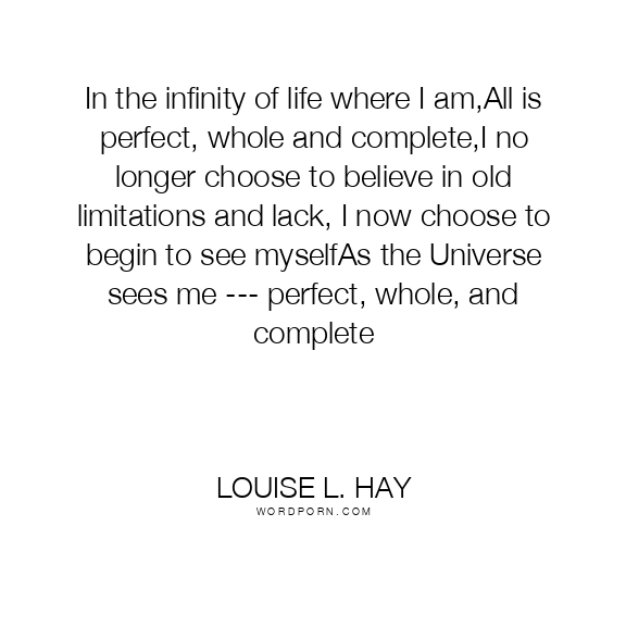 In the infinity of life where I am,All is perfect, whole and complete,I no longer choose to believe in old limitations and lack, I now choose to begin to see myselfAs the Universe sees me --- perfect, whole, and complete