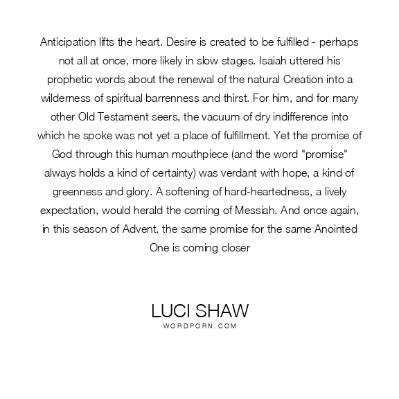 Anticipation lifts the heart. Desire is created to be fulfilled - perhaps not all at once, more likely in slow stages. Isaiah uttered his prophetic words about the renewal of the natural Creation into a wilderness of spiritual barrenness and thirst. For him, and for many other Old Testament seers, the vacuum of dry indifference into which he spoke was not yet a place of fulfillment. Yet the promise of God through this human mouthpiece (and the word "promise" always holds a kind of certainty) was verdant with hope, a kind of greenness and glory. A softening of hard-heartedness, a lively expectation, would herald the coming of Messiah. And once again, in this season of Advent, the same promise for the same Anointed One is coming closer
