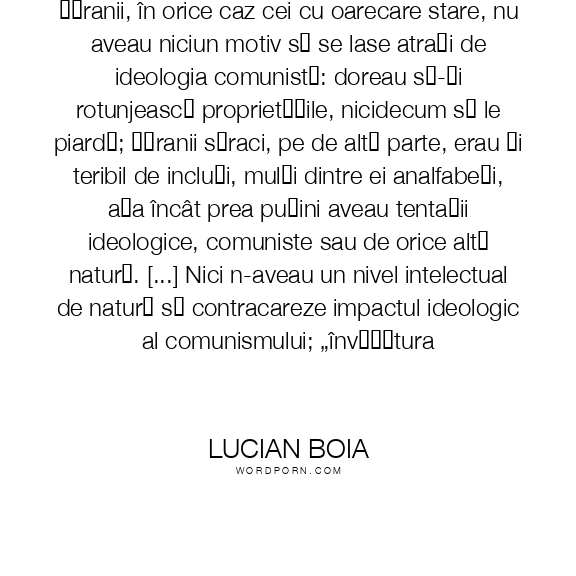 Țăranii, în orice caz cei cu oarecare stare, nu aveau niciun motiv să se lase atrași de ideologia comunistă: doreau să-și rotunjească proprietățile, nicidecum să le piardă; țăranii săraci, pe de altă parte, erau și teribil de incluți, mulți dintre ei analfabeți, așa încât prea puțini aveau tentații ideologice, comuniste sau de orice altă natură. [...] Nici n-aveau un nivel intelectual de natură să contracareze impactul ideologic al comunismului; „învățătura