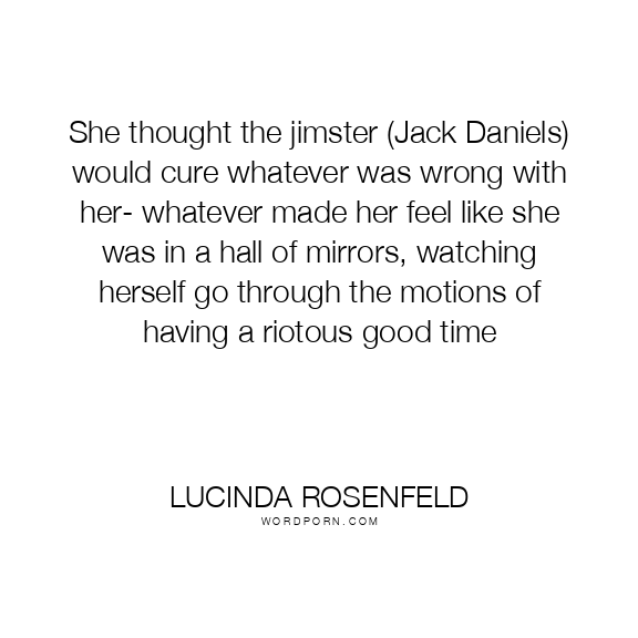 She thought the jimster (Jack Daniels) would cure whatever was wrong with her- whatever made her feel like she was in a hall of mirrors, watching herself go through the motions of having a riotous good time