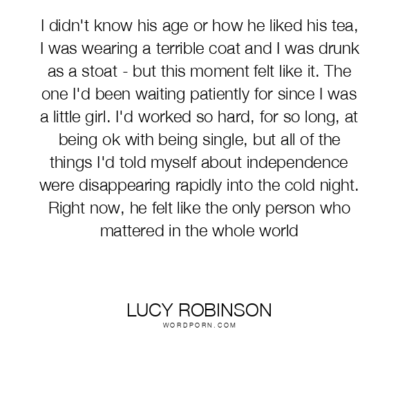 I didn't know his age or how he liked his tea, I was wearing a terrible coat and I was drunk as a stoat - but this moment felt like it. The one I'd been waiting patiently for since I was a little girl. I'd worked so hard, for so long, at being ok with being single, but all of the things I'd told myself about independence were disappearing rapidly into the cold night. Right now, he felt like the only person who mattered in the whole world