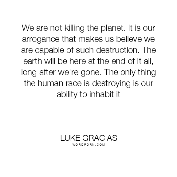 We are not killing the planet. It is our arrogance that makes us believe we are capable of such destruction. The earth will be here at the end of it all, long after we're gone. The only thing the human race is destroying is our ability to inhabit it