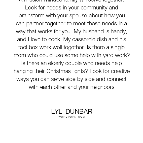 A mission-minded family will serve together. Look for needs in your community and brainstorm with your spouse about how you can partner together to meet those needs in a way that works for you. My husband is handy, and I love to cook. My casserole dish and his tool box work well together. Is there a single mom who could use some help with yard work? Is there an elderly couple who needs help hanging their Christmas lights? Look for creative ways you can serve side by side and connect with each other and your neighbors