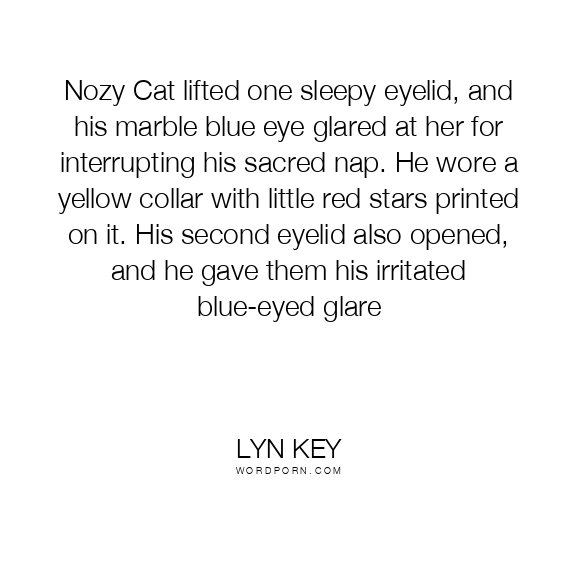 Nozy Cat lifted one sleepy eyelid, and his marble blue eye glared at her for interrupting his sacred nap. He wore a yellow collar with little red stars printed on it. His second eyelid also opened, and he gave them his irritated blue-eyed glare