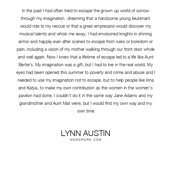 In the past I had often tried to escape the grown-up world of sorrow through my imagination- dreaming that a handsome young lieutenant would ride to my rescue or that a great empresario would discover my musical talents and whisk me away. I had envisioned knights in shining armor and happily ever after scenes to escape from rules or boredom or pain; including a vision of my mother walking through our front door whole and well again. Now I knew that a lifetime of escape led to a life like Aunt Bertie's. My imagination was a gift, but I had to live in the real world. My eyes had been opened this summer to poverty and crime and abuse and I needed to use my imagination not to escape, but to help people like Irina and Katya, to make my own contribution as the women in the women's pavilion had done. I couldn't do it in the same way Jane Adams and my grandmother and Aunt Mat were, but I would find my own way and my own time