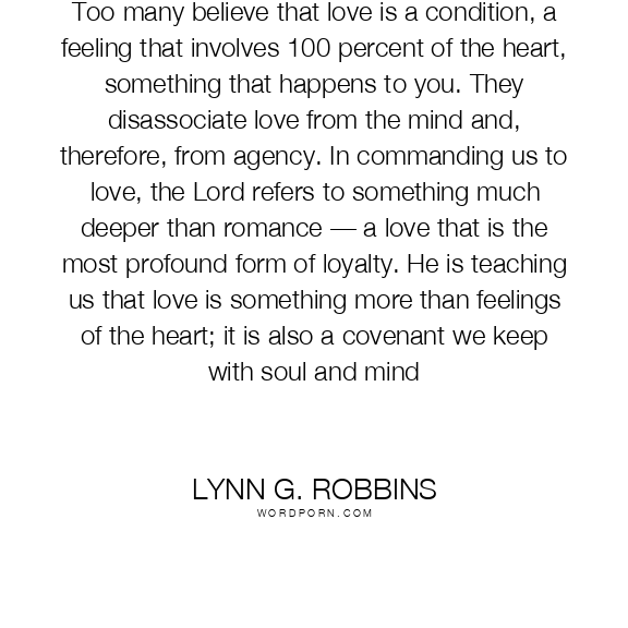 Too many believe that love is a condition, a feeling that involves 100 percent of the heart, something that happens to you. They disassociate love from the mind and, therefore, from agency. In commanding us to love, the Lord refers to something much deeper than romance — a love that is the most profound form of loyalty. He is teaching us that love is something more than feelings of the heart; it is also a covenant we keep with soul and mind