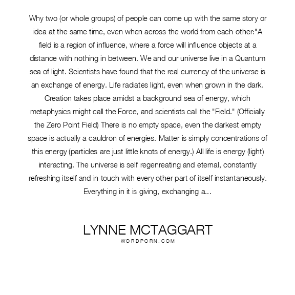 Why two (or whole groups) of people can come up with the same story or idea at the same time, even when across the world from each-other:"A field is a region of influence, where a force will influence objects at a distance with nothing in between. We and our universe live in a Quantum sea of light. Scientists have found that the real currency of the universe is an exchange of energy. Life radiates light, even when grown in the dark. Creation takes place amidst a background sea of energy, which metaphysics might call the Force, and scientists call the "Field." (Officially the Zero Point Field) There is no empty space, even the darkest empty space is actually a cauldron of energies. Matter is simply concentrations of this energy (particles are just little knots of energy.) All life is energy (light) interacting. The universe is self-regenreating and eternal, constantly refreshing itself and in touch with every other part of itself instantaneously. Everything in it is giving, exchanging and interacting with energy, coming in and out of existence at every level. The self has a field of influence on the world and visa versa based on this energy.Biology has more and more been determined a quantum process, and consciousness as well, functions at the quantum level (connected to a universe of energy that underlies and connects everything). Scientist Walter Schempp's showed that long and short term memory is stored not in our brain but in this "Field" of energy or light that pervades and creates the universe and world we live in.A number of scientists since him would go on to argue that the brain is simply the retrieval and read-out mechanism of the ultimate storage medium - the Field. Associates from Japan would hypothesize that what we think of as memory is simply a coherent emission of signals from the "Field," and that longer memories are a structured grouping of this wave information. If this were true, it would explain why one tiny association often triggers a riot of sights, sounds and smells. It would also explain why, with long-term memory in particular, recall is instantaneous and doesn't require any scanning mechanism to sift through years and years of memory.If they are correct, our brain is not a storage medium but a receiving mechanism in every sense, and memory is simply a distant cousin of perception.Some scientists went as far as to suggest that all of our higher cognitive processes result from an interaction with the Field. This kind of constant interaction might account for intuition or creativity - and how ideas come to us in bursts of insight, sometimes in fragments but often as a miraculous whole. An intuitive leap might simply be a sudden coalescence of coherence in the Field.The fact that the human body was exchanging information with a mutable field of quantum fluctuation suggested something profound about the world. It hinted at human capabilities for knowledge and communication far deeper and more extended than we presently understand. It also blurred the boundary lines of our individuality - our very sense of separateness. If living things boil down to charged particles interacting with a Field and sending out and receiving quantum information, where did we end and the rest of the world began? Where was consciousness-encased inside our bodies or out there in the Field?Indeed, there was no more 'out there' if we and the rest of the world were so intrinsically interconnected. In ignoring the effect of the "Field" modern physicists set mankind back, by eliminating the possibility of interconnectedness and obscuring a scientific explanation for many kinds of miracles. In re-normalizing their equations (to leave this part out) what they'd been doing was a little like subtracting God