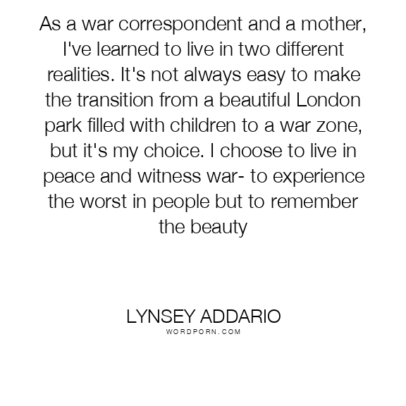 As a war correspondent and a mother, I've learned to live in two different realities. It's not always easy to make the transition from a beautiful London park filled with children to a war zone, but it's my choice. I choose to live in peace and witness war- to experience the worst in people but to remember the beauty