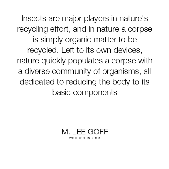 Insects are major players in nature's recycling effort, and in nature a corpse is simply organic matter to be recycled. Left to its own devices, nature quickly populates a corpse with a diverse community of organisms, all dedicated to reducing the body to its basic components