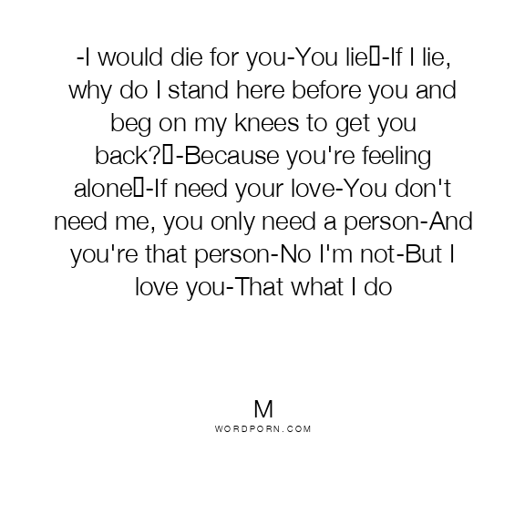 -I would die for you-You lie -If I lie, why do I stand here before you and beg on my knees to get you back? -Because you're feeling alone -If need your love-You don't need me, you only need a person-And you're that person-No I'm not-But I love you-That what I do
