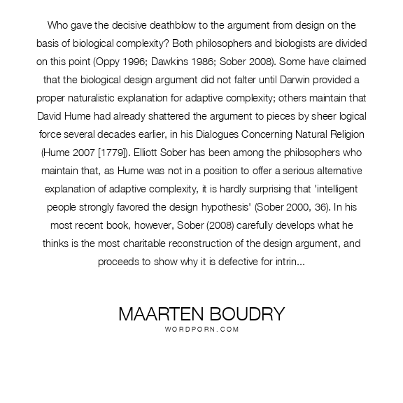 Who gave the decisive deathblow to the argument from design on the basis of biological complexity? Both philosophers and biologists are divided on this point (Oppy 1996; Dawkins 1986; Sober 2008). Some have claimed that the biological design argument did not falter until Darwin provided a proper naturalistic explanation for adaptive complexity; others maintain that David Hume had already shattered the argument to pieces by sheer logical force several decades earlier, in his Dialogues Concerning Natural Religion (Hume 2007 [1779]). Elliott Sober has been among the philosophers who maintain that, as Hume was not in a position to offer a serious alternative explanation of adaptive complexity, it is hardly surprising that 'intelligent people strongly favored the design hypothesis' (Sober 2000, 36). In his most recent book, however, Sober (2008) carefully develops what he thinks is the most charitable reconstruction of the design argument, and proceeds to show why it is defective for intrinsic reasons (for earlier version of this argument, see Sober 1999, 2002). Sober argues that the design argument can be rejected even without the need to consider alternative explanations for adaptive complexity (Sober 2008, 126): 'To see why the design argument is defective, there is no need to have a view as to whether Darwin’s theory of evolution is true' (Sober 2008, 154)