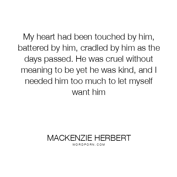 My heart had been touched by him, battered by him, cradled by him as the days passed. He was cruel without meaning to be yet he was kind, and I needed him too much to let myself want him