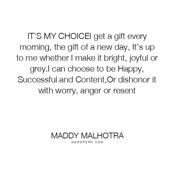 IT’S MY CHOICEI get a gift every morning, the gift of a new day, It’s up to me whether I make it bright, joyful or grey.I can choose to be Happy, Successful and Content,Or dishonor it with worry, anger or resent