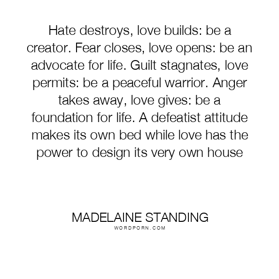 Hate destroys, love builds: be a creator. Fear closes, love opens: be an advocate for life. Guilt stagnates, love permits: be a peaceful warrior. Anger takes away, love gives: be a foundation for life. A defeatist attitude makes its own bed while love has the power to design its very own house