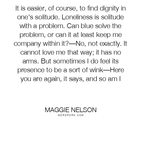 It is easier, of course, to find dignity in one's solitude. Loneliness is solitude with a problem. Can blue solve the problem, or can it at least keep me company within it?—No, not exactly. It cannot love me that way; it has no arms. But sometimes I do feel its presence to be a sort of wink—Here you are again, it says, and so am I