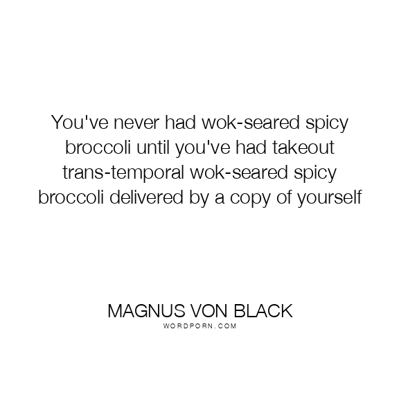 Copy Image You've never had wok-seared spicy broccoli until you've had takeout trans-temporal wok-seared spicy broccoli delivered by a copy of yourself Moms Typewriter A A SAVE THIS IMAGE