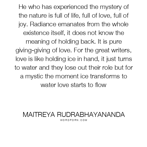 He who has experienced the mystery of the nature is full of life, full of love, full of joy. Radiance emanates from the whole existence itself, it does not know the meaning of holding back. It is pure giving-giving of love. For the great writers, love is like holding ice in hand, it just turns to water and they lose out their role but for a mystic the moment ice transforms to water love starts to flow