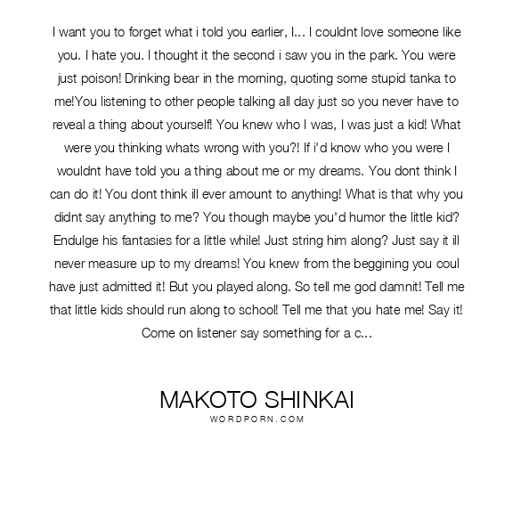 I want you to forget what i told you earlier, I... I couldnt love someone like you. I hate you. I thought it the second i saw you in the park. You were just poison! Drinking bear in the morning, quoting some stupid tanka to me!You listening to other people talking all day just so you never have to reveal a thing about yourself! You knew who I was, I was just a kid! What were you thinking whats wrong with you?! If i'd know who you were I wouldnt have told you a thing about me or my dreams. You dont think I can do it! You dont think ill ever amount to anything! What is that why you didnt say anything to me? You though maybe you'd humor the little kid? Endulge his fantasies for a little while! Just string him along? Just say it ill never measure up to my dreams! You knew from the beggining you coul have just admitted it! But you played along. So tell me god damnit! Tell me that little kids should run along to school! Tell me that you hate me! Say it! Come on listener say something for a change! You loser! Its because you act like that. You never say what's important! You act like it's non of your buisness! You've been living your whole life alone!