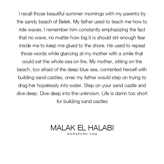 I recall those beautiful summer mornings with my parents by the sandy beach of Belek. My father used to teach me how to ride waves. I remember him constantly emphasizing the fact that no wave, no matter how big it is should stir enough fear inside me to keep me glued to the shore. He used to repeat those words while glancing at my mother with a smile that could set the whole sea on fire. My mother, sitting on the beach, too afraid of the deep blue sea, contented herself with building sand castles, ones my father would step on trying to drag her hopelessly into water. Step on your sand castle and dive deep. Dive deep into the unknown. Life is damn too short for building sand castles