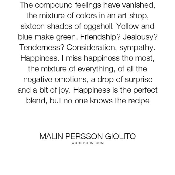 The compound feelings have vanished, the mixture of colors in an art shop, sixteen shades of eggshell. Yellow and blue make green. Friendship? Jealousy? Tenderness? Consideration, sympathy. Happiness. I miss happiness the most, the mixture of everything, of all the negative emotions, a drop of surprise and a bit of joy. Happiness is the perfect blend, but no one knows the recipe