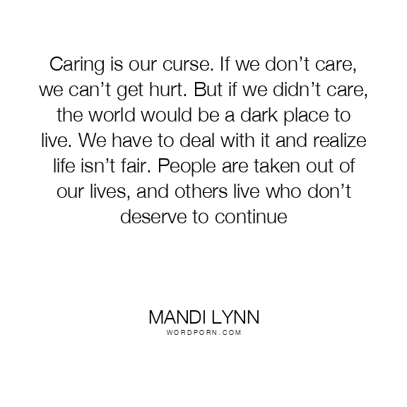 Caring is our curse. If we don’t care, we can’t get hurt. But if we didn’t care, the world would be a dark place to live. We have to deal with it and realize life isn’t fair. People are taken out of our lives, and others live who don’t deserve to continue