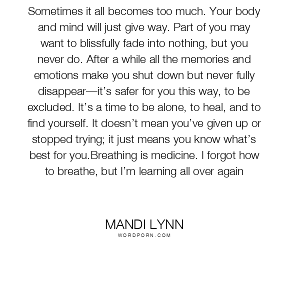 Sometimes it all becomes too much. Your body and mind will just give way. Part of you may want to blissfully fade into nothing, but you never do. After a while all the memories and emotions make you shut down but never fully disappear—it’s safer for you this way, to be excluded. It’s a time to be alone, to heal, and to find yourself. It doesn’t mean you’ve given up or stopped trying; it just means you know what’s best for you.Breathing is medicine. I forgot how to breathe, but I’m learning all over again