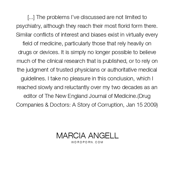 [...] The problems I’ve discussed are not limited to psychiatry, although they reach their most florid form there. Similar conflicts of interest and biases exist in virtually every field of medicine, particularly those that rely heavily on drugs or devices. It is simply no longer possible to believe much of the clinical research that is published, or to rely on the judgment of trusted physicians or authoritative medical guidelines. I take no pleasure in this conclusion, which I reached slowly and reluctantly over my two decades as an editor of The New England Journal of Medicine.(Drug Companies & Doctors: A Story of Corruption, Jan 15 2009)