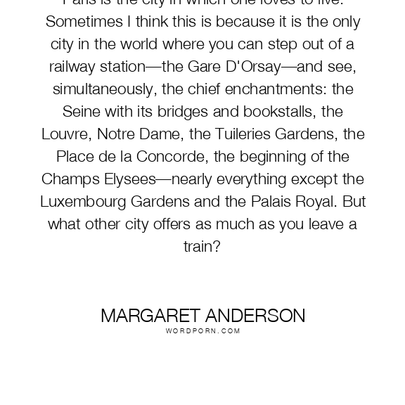 Paris is the city in which one loves to live. Sometimes I think this is because it is the only city in the world where you can step out of a railway station—the Gare D'Orsay—and see, simultaneously, the chief enchantments: the Seine with its bridges and bookstalls, the Louvre, Notre Dame, the Tuileries Gardens, the Place de la Concorde, the beginning of the Champs Elysees—nearly everything except the Luxembourg Gardens and the Palais Royal. But what other city offers as much as you leave a train?