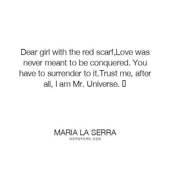 Dear girl with the red scarf,Love was never meant to be conquered. You have to surrender to it.Trust me, after all, I am Mr. Universe.