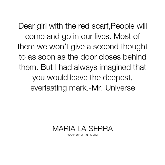 Dear girl with the red scarf,People will come and go in our lives. Most of them we won’t give a second thought to as soon as the door closes behind them. But I had always imagined that you would leave the deepest, everlasting mark.-Mr. Universe