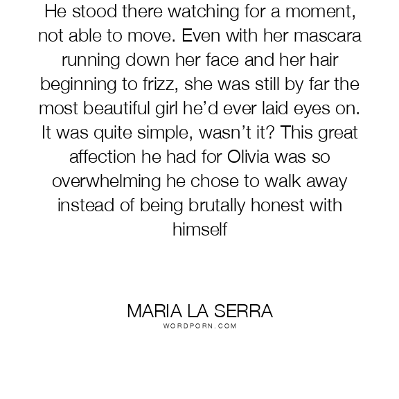 He stood there watching for a moment, not able to move. Even with her mascara running down her face and her hair beginning to frizz, she was still by far the most beautiful girl he’d ever laid eyes on. It was quite simple, wasn’t it? This great affection he had for Olivia was so overwhelming he chose to walk away instead of being brutally honest with himself