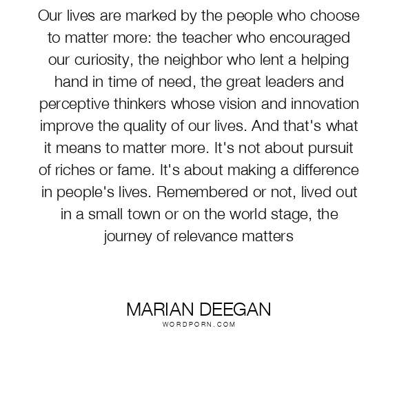 Our lives are marked by the people who choose to matter more: the teacher who encouraged our curiosity, the neighbor who lent a helping hand in time of need, the great leaders and perceptive thinkers whose vision and innovation improve the quality of our lives. And that's what it means to matter more. It's not about pursuit of riches or fame. It's about making a difference in people's lives. Remembered or not, lived out in a small town or on the world stage, the journey of relevance matters