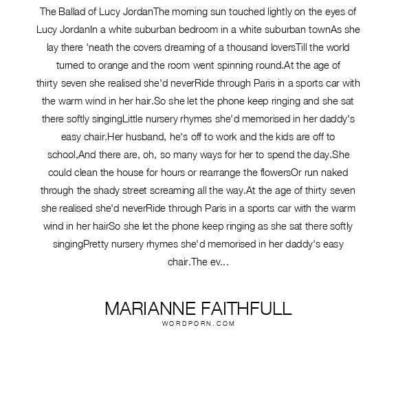 The Ballad of Lucy JordanThe morning sun touched lightly on the eyes of Lucy JordanIn a white suburban bedroom in a white suburban townAs she lay there 'neath the covers dreaming of a thousand loversTill the world turned to orange and the room went spinning round.At the age of thirty-seven she realised she'd neverRide through Paris in a sports car with the warm wind in her hair.So she let the phone keep ringing and she sat there softly singingLittle nursery rhymes she'd memorised in her daddy's easy chair.Her husband, he's off to work and the kids are off to school,And there are, oh, so many ways for her to spend the day.She could clean the house for hours or rearrange the flowersOr run naked through the shady street screaming all the way.At the age of thirty-seven she realised she'd neverRide through Paris in a sports car with the warm wind in her hairSo she let the phone keep ringing as she sat there softly singingPretty nursery rhymes she'd memorised in her daddy's easy chair.The evening sun touched gently on the eyes of Lucy JordanOn the roof top where she climbed when all the laughter grew too loudAnd she bowed and curtsied to the man who reached and offered her his hand,And he led her down to the long white car that waited past the crowd.At the age of thirty-seven she knew she'd found foreverAs she rode along through Paris with the warm wind in her hair