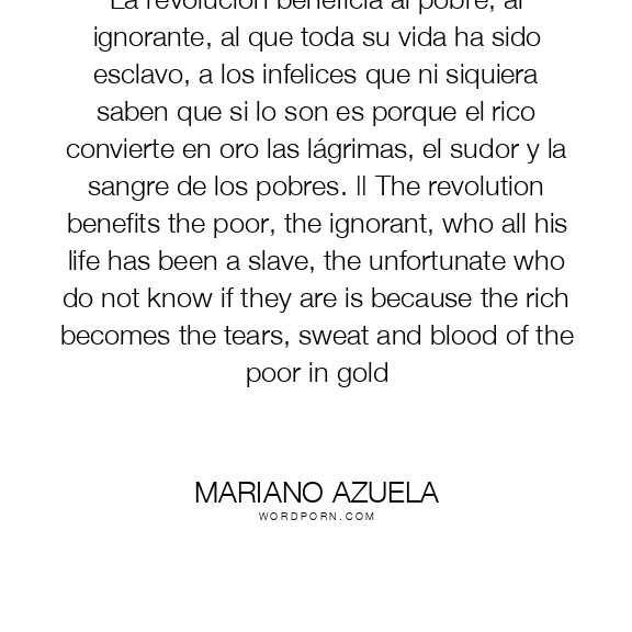 La revolución beneficia al pobre, al ignorante, al que toda su vida ha sido esclavo, a los infelices que ni siquiera saben que si lo son es porque el rico convierte en oro las lágrimas, el sudor y la sangre de los pobres. || The revolution benefits the poor, the ignorant, who all his life has been a slave, the unfortunate who do not know if they are is because the rich becomes the tears, sweat and blood of the poor in gold