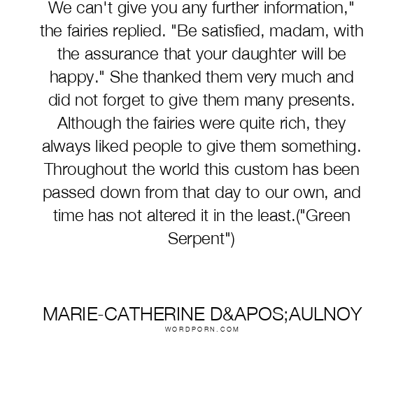 We can't give you any further information," the fairies replied. "Be satisfied, madam, with the assurance that your daughter will be happy." She thanked them very much and did not forget to give them many presents. Although the fairies were quite rich, they always liked people to give them something. Throughout the world this custom has been passed down from that day to our own, and time has not altered it in the least.("Green Serpent")