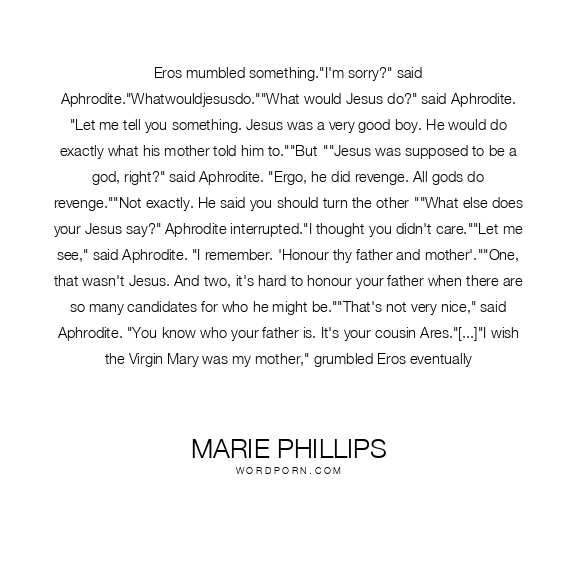 Eros mumbled something."I'm sorry?" said Aphrodite."Whatwouldjesusdo.""What would Jesus do?" said Aphrodite. "Let me tell you something. Jesus was a very good boy. He would do exactly what his mother told him to.""But-""Jesus was supposed to be a god, right?" said Aphrodite. "Ergo, he did revenge. All gods do revenge.""Not exactly. He said you should turn the other-""What else does your Jesus say?" Aphrodite interrupted."I thought you didn't care.""Let me see," said Aphrodite. "I remember. 'Honour thy father and mother'.""One, that wasn't Jesus. And two, it's hard to honour your father when there are so many candidates for who he might be.""That's not very nice," said Aphrodite. "You know who your father is. It's your cousin Ares."[...]"I wish the Virgin Mary was my mother," grumbled Eros eventually