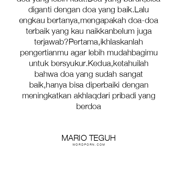 Doa yang lemah,bisa diperbaiki dengan doa yang lebih kuat.Doa yang buruk,bisa diganti dengan doa yang baik.Lalu engkau bertanya,mengapakah doa-doa terbaik yang kau naikkanbelum juga terjawab?Pertama,ikhlaskanlah pengertianmu agar lebih mudahbagimu untuk bersyukur.Kedua,ketahuilah bahwa doa yang sudah sangat baik,hanya bisa diperbaiki dengan meningkatkan akhlaqdari pribadi yang berdoa
