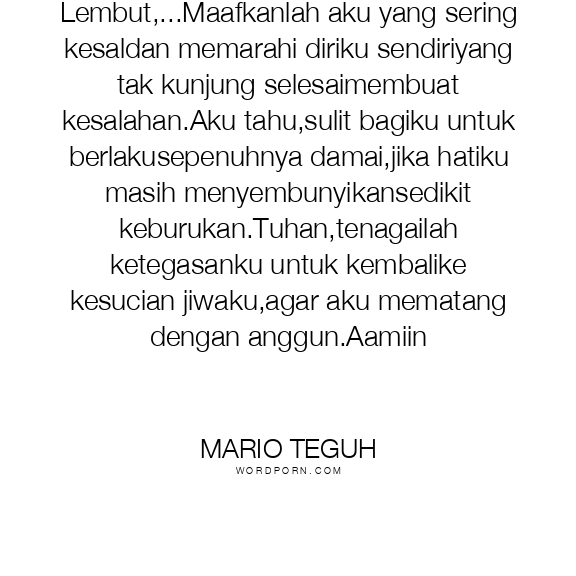 Tuhanku Yang Maha Lembut,...Maafkanlah aku yang sering kesaldan memarahi diriku sendiriyang tak kunjung selesaimembuat kesalahan.Aku tahu,sulit bagiku untuk berlakusepenuhnya damai,jika hatiku masih menyembunyikansedikit keburukan.Tuhan,tenagailah ketegasanku untuk kembalike kesucian jiwaku,agar aku mematang dengan anggun.Aamiin
