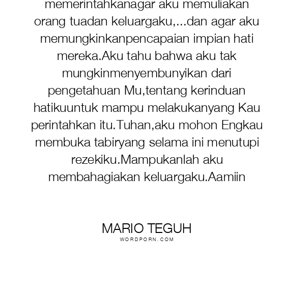 uhanku Yang Maha Penyayang,Engkau memerintahkanagar aku memuliakan orang tuadan keluargaku,...dan agar aku memungkinkanpencapaian impian hati mereka.Aku tahu bahwa aku tak mungkinmenyembunyikan dari pengetahuan Mu,tentang kerinduan hatikuuntuk mampu melakukanyang Kau perintahkan itu.Tuhan,aku mohon Engkau membuka tabiryang selama ini menutupi rezekiku.Mampukanlah aku membahagiakan keluargaku.Aamiin