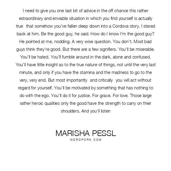 I need to give you one last bit of advice in the off chance this rather extraordinary and enviable situation in which you find yourself is actually true- that somehow you've fallen deep down into a Cordova story. I stared back at him. Be the good guy, he said. How do I know I'm the good guy? He pointed at me, nodding. A very wise question. You don't. Most bad guys think they're good. But there are a few signifiers. You'll be miserable. You'll be hated. You'll fumble around in the dark, alone and confused. You'll have little insight as to the true nature of things, not until the very last minute, and only if you have the stamina and the madness to go to the very, very end. But most importantly- and critically- you will act without regard for yourself. You'll be motivated by something that has nothing to do with the ego. You'll do it for justice. For grace. For love. Those large rather heroic qualities only the good have the strength to carry on their shoulders. And you'll listen