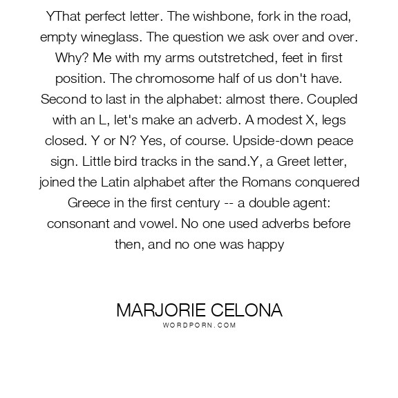 YThat perfect letter. The wishbone, fork in the road, empty wineglass. The question we ask over and over. Why? Me with my arms outstretched, feet in first position. The chromosome half of us don't have. Second to last in the alphabet: almost there. Coupled with an L, let's make an adverb. A modest X, legs closed. Y or N? Yes, of course. Upside-down peace sign. Little bird tracks in the sand.Y, a Greet letter, joined the Latin alphabet after the Romans conquered Greece in the first century -- a double agent: consonant and vowel. No one used adverbs before then, and no one was happy