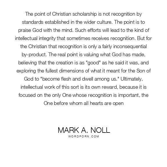 The point of Christian scholarship is not recognition by standards established in the wider culture. The point is to praise God with the mind. Such efforts will lead to the kind of intellectual integrity that sometimes receives recognition. But for the Christian that recognition is only a fairly inconsequential by-product. The real point is valuing what God has made, believing that the creation is as "good" as he said it was, and exploring the fullest dimensions of what it meant for the Son of God to "become flesh and dwell among us." Ultimately, intellectual work of this sort is its own reward, because it is focused on the only One whose recognition is important, the One before whom all hearts are open
