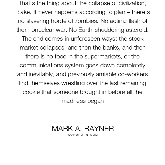That’s the thing about the collapse of civilization, Blake. It never happens according to plan – there’s no slavering horde of zombies. No actinic flash of thermonuclear war. No Earth-shuddering asteroid. The end comes in unforeseen ways; the stock market collapses, and then the banks, and then there is no food in the supermarkets, or the communications system goes down completely and inevitably, and previously amiable co-workers find themselves wrestling over the last remaining cookie that someone brought in before all the madness began
