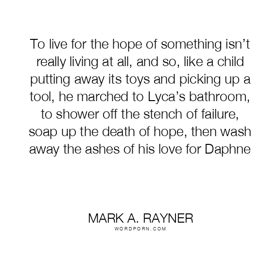 To live for the hope of something isn’t really living at all, and so, like a child putting away its toys and picking up a tool, he marched to Lyca’s bathroom, to shower off the stench of failure, soap up the death of hope, then wash away the ashes of his love for Daphne