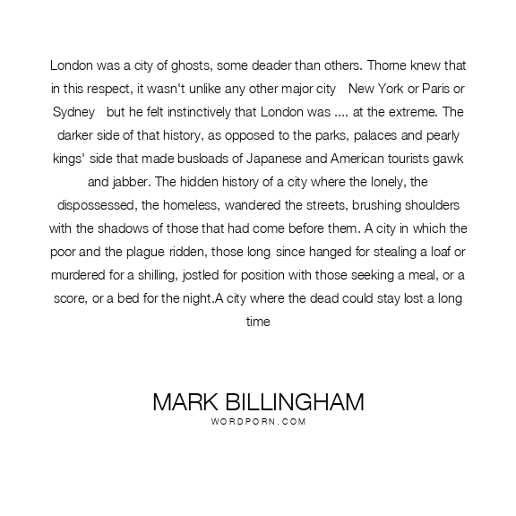 London was a city of ghosts, some deader than others. Thorne knew that in this respect, it wasn't unlike any other major city - New York or Paris or Sydney - but he felt instinctively that London was .... at the extreme. The darker side of that history, as opposed to the parks, palaces and pearly kings' side that made busloads of Japanese and American tourists gawk and jabber. The hidden history of a city where the lonely, the dispossessed, the homeless, wandered the streets, brushing shoulders with the shadows of those that had come before them. A city in which the poor and the plague-ridden, those long-since hanged for stealing a loaf or murdered for a shilling, jostled for position with those seeking a meal, or a score, or a bed for the night.A city where the dead could stay lost a long time
