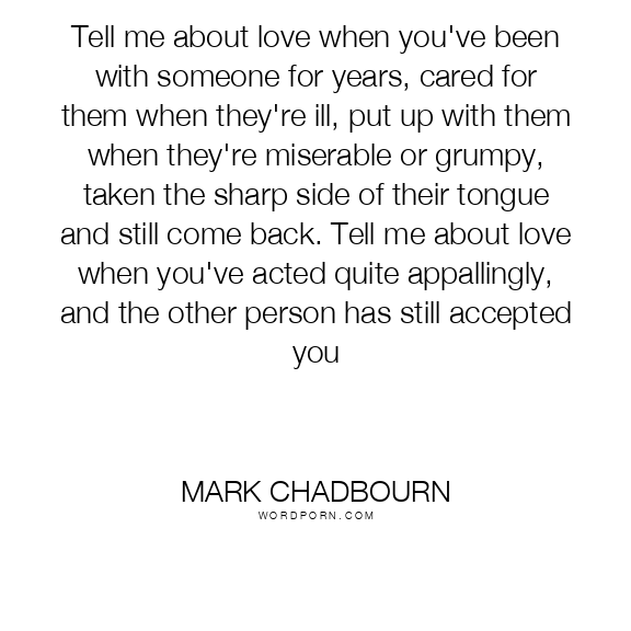 Tell me about love when you've been with someone for years, cared for them when they're ill, put up with them when they're miserable or grumpy, taken the sharp side of their tongue and still come back. Tell me about love when you've acted quite appallingly, and the other person has still accepted you
