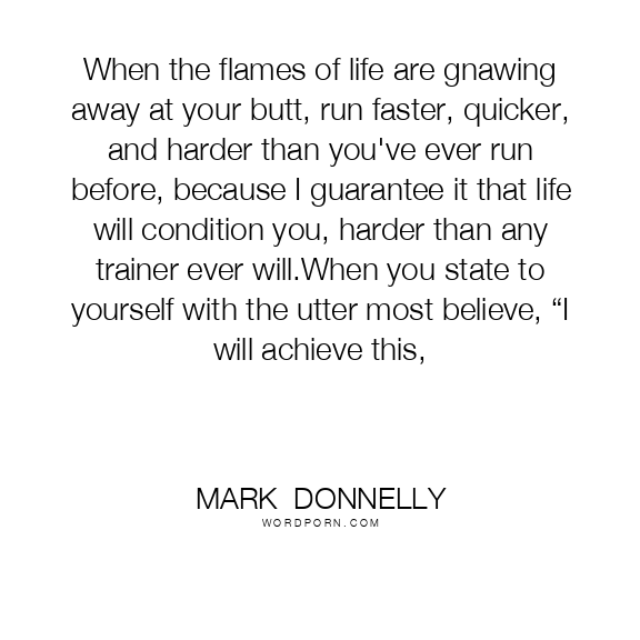 When the flames of life are gnawing away at your butt, run faster, quicker, and harder than you've ever run before, because I guarantee it that life will condition you, harder than any trainer ever will.When you state to yourself with the utter most believe, “I will achieve this,